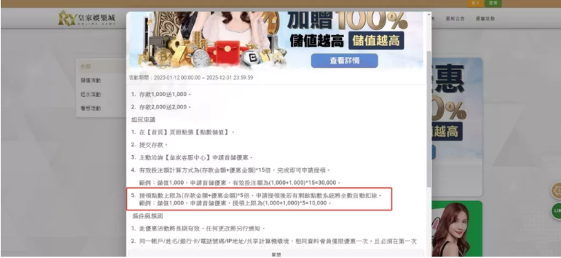 Người chơi nạp tiền lần đầu có thể nhận được điểm thưởng tương đương 100% kubet thiên hạ giá trị và số lần rút cần đạt gấp 15 lần doanh thu, nhưng giới hạn trên của số tiền rút: chỉ có thể rút "5 lần (giá trị đã nạp + giảm giá)" nhiều nhất.